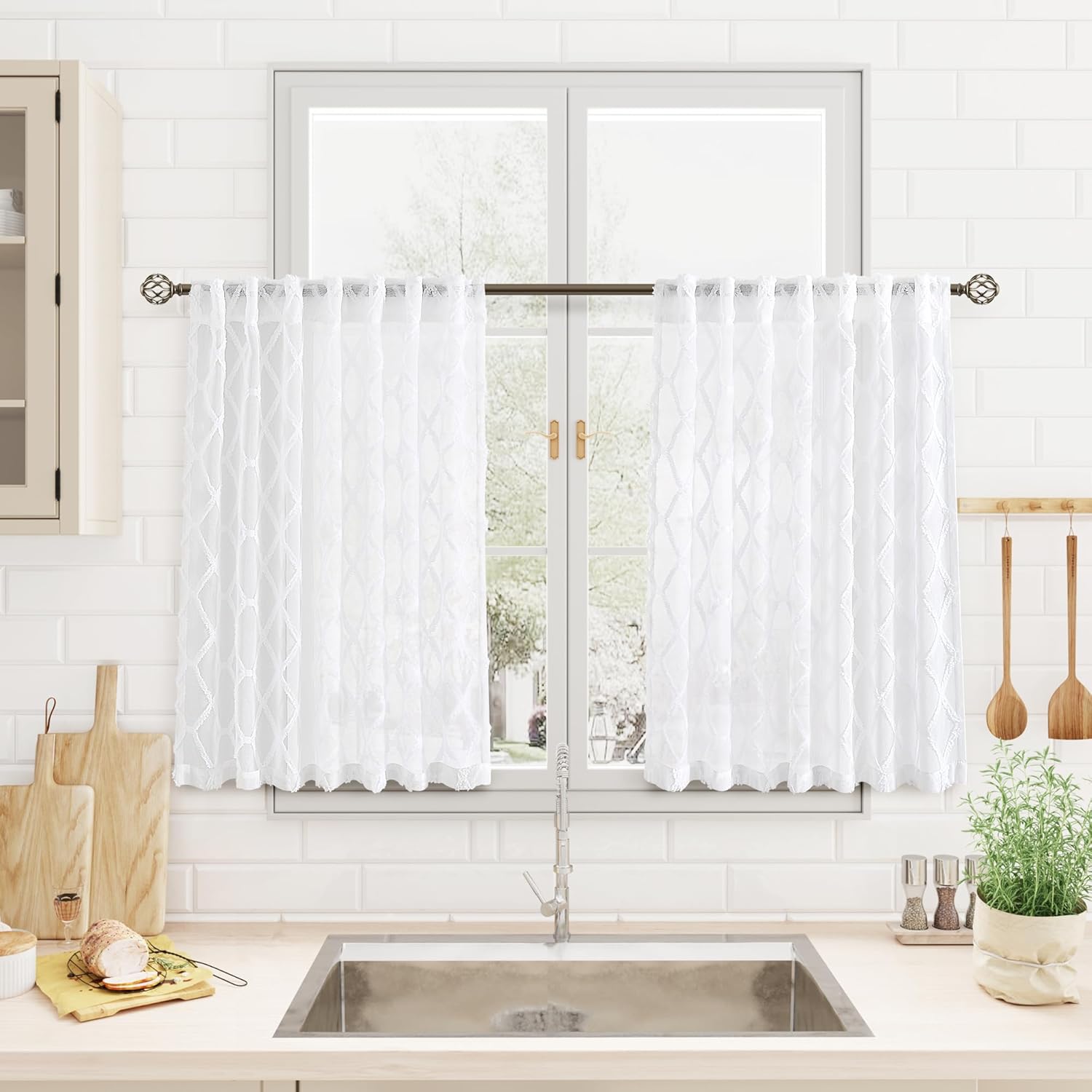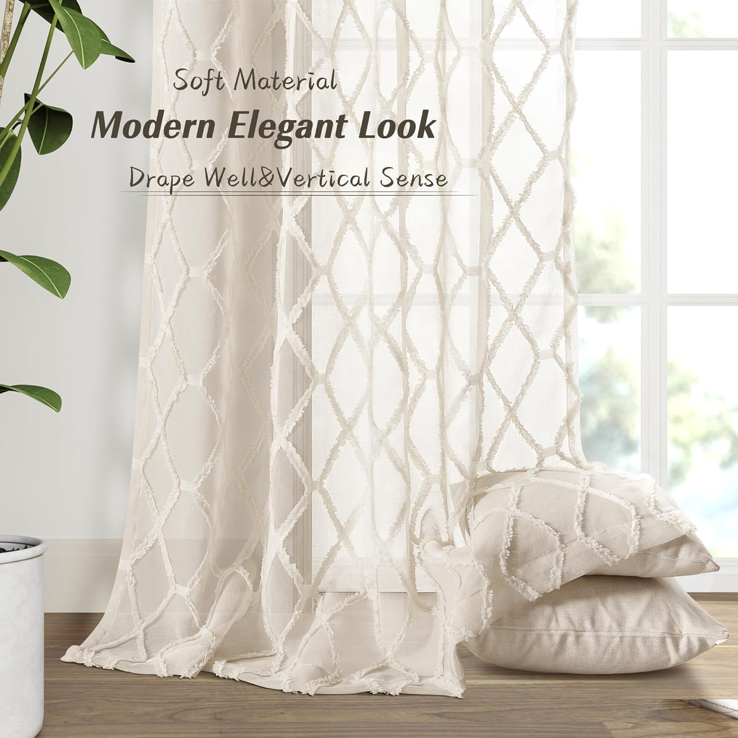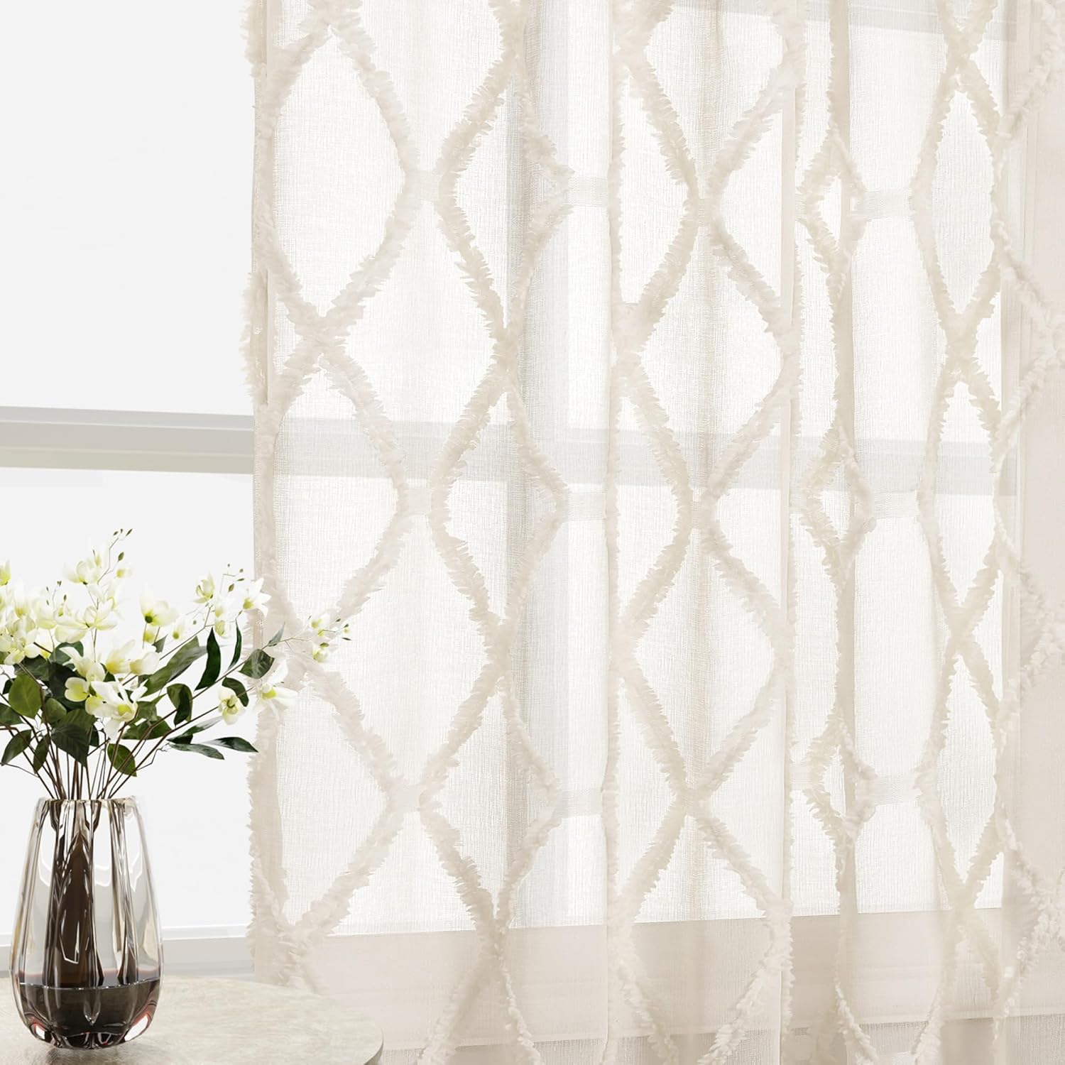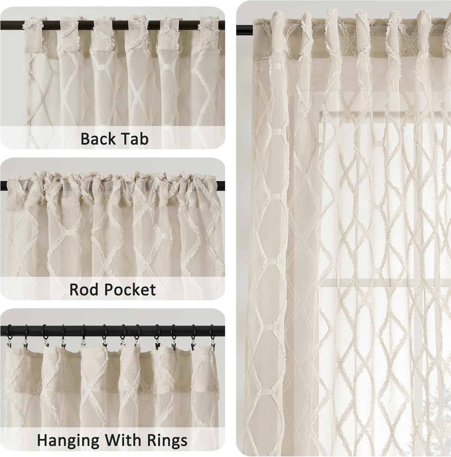 Beige Sheer Curtains 84 Inches Long for Living Room Rod Pocket Back Tab Sand Taupe Tan Semi Sheer Curtain Geometric Embroidered Tuft Pom Textured Drapes Earth Tone Farmhouse Rustic Bedroom Nursery