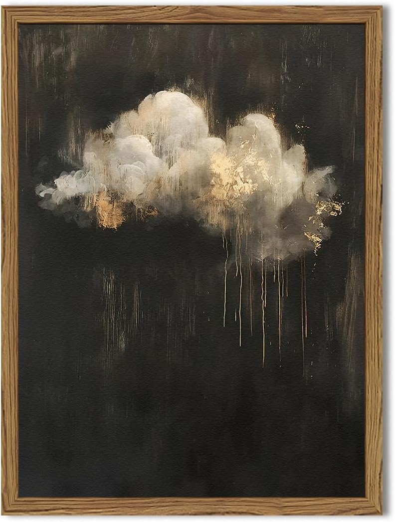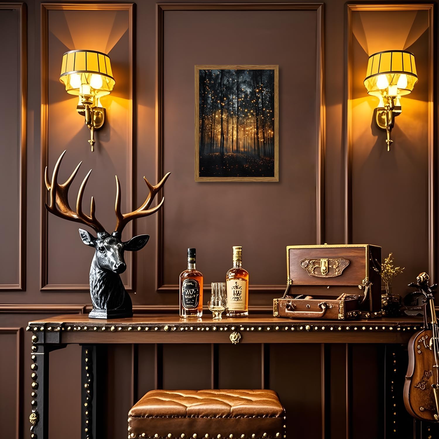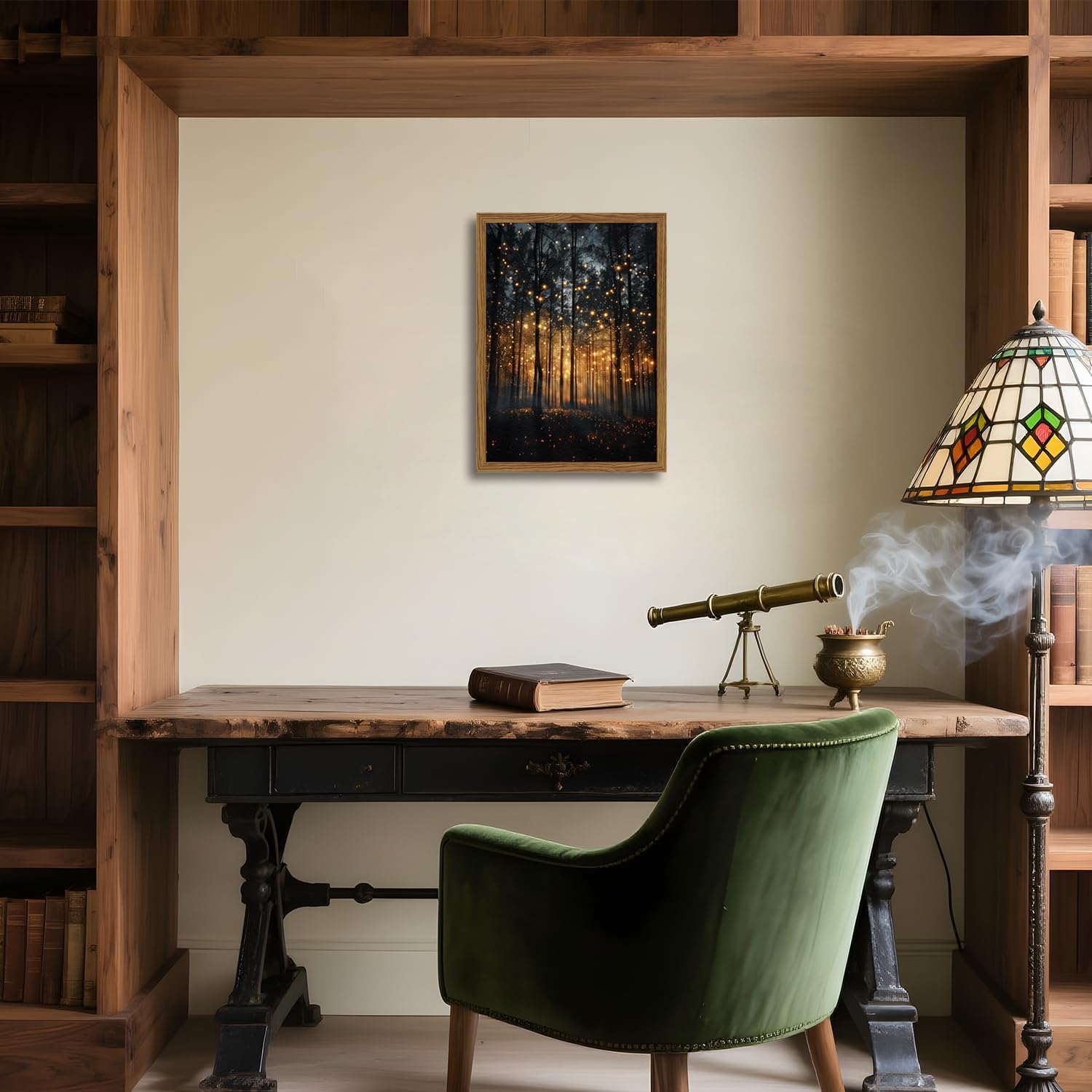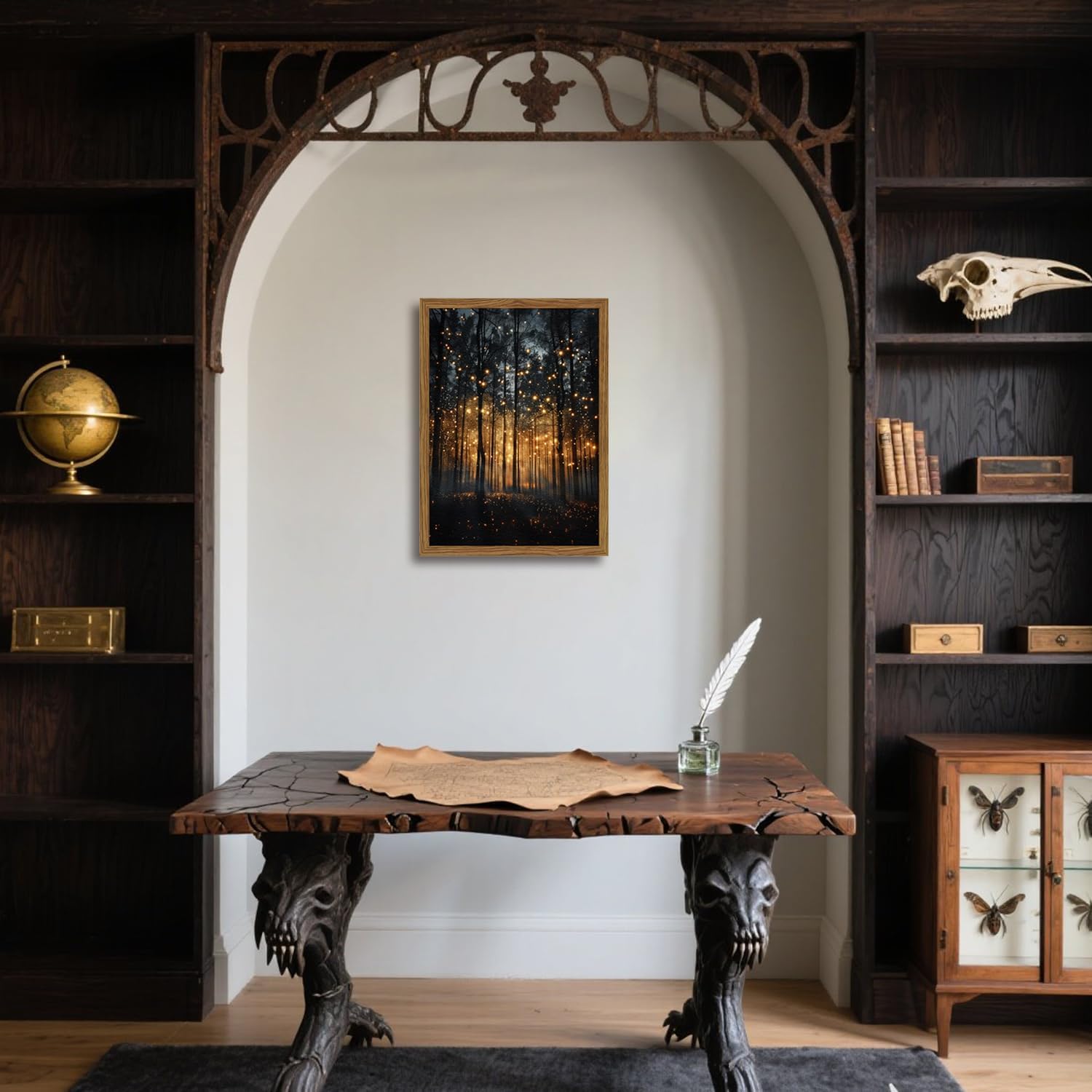 Enchanted Forest Firefly Wall Art, Dark Twilight Landscape Wall Decor 3D Texture Hand Drawn Sandstone Magical Nature Botanical Painting Artwork for Bedroom Living Room 24x16 inch Wood Framed