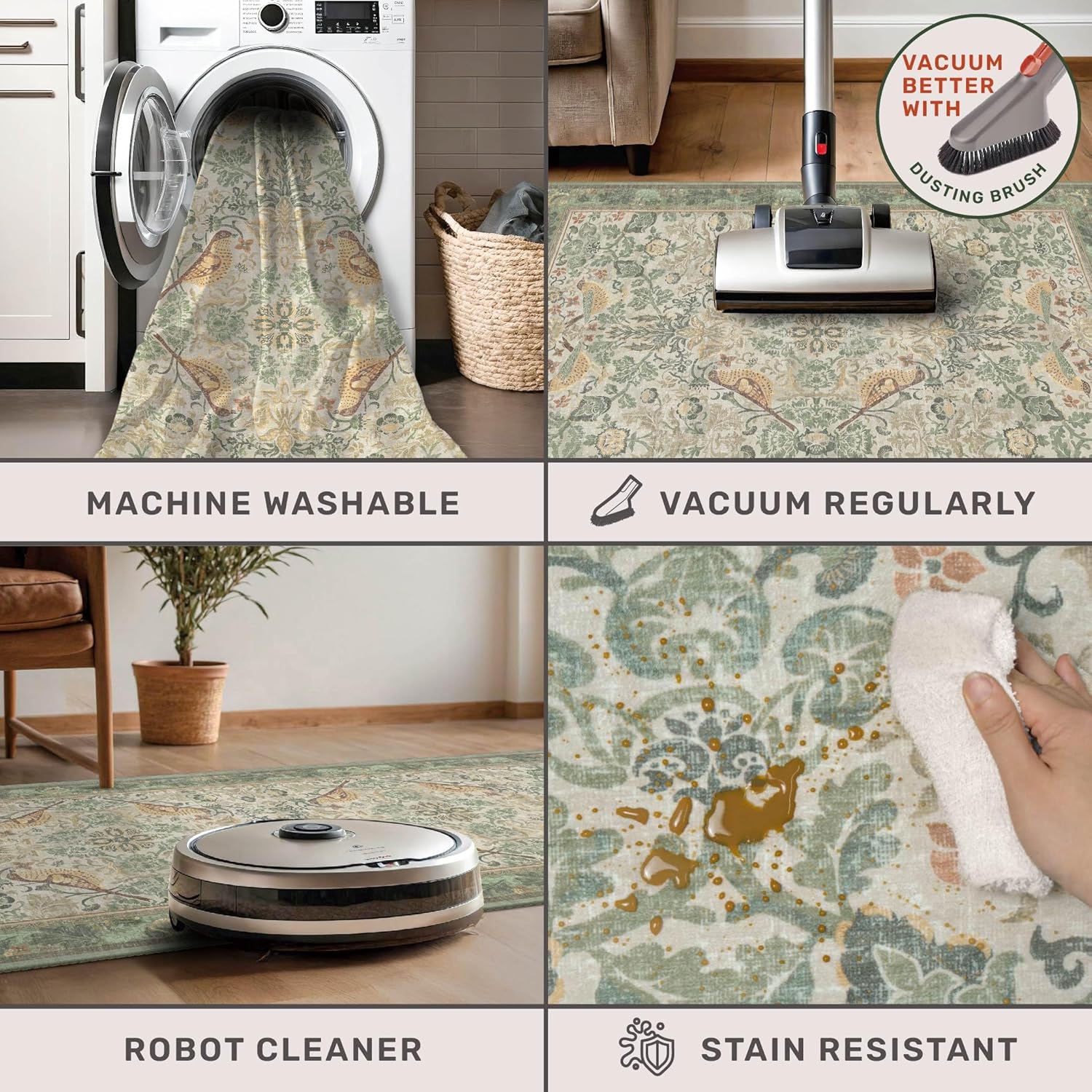 Washable Area Rugs 5x8 for Bedroom - Western Plant Rugs for Living Room, Dinning Room, Home Office, Playroom with Boho Light Green Botanical & Bird Pattern, Non Slip Stain Resistant Low Pile