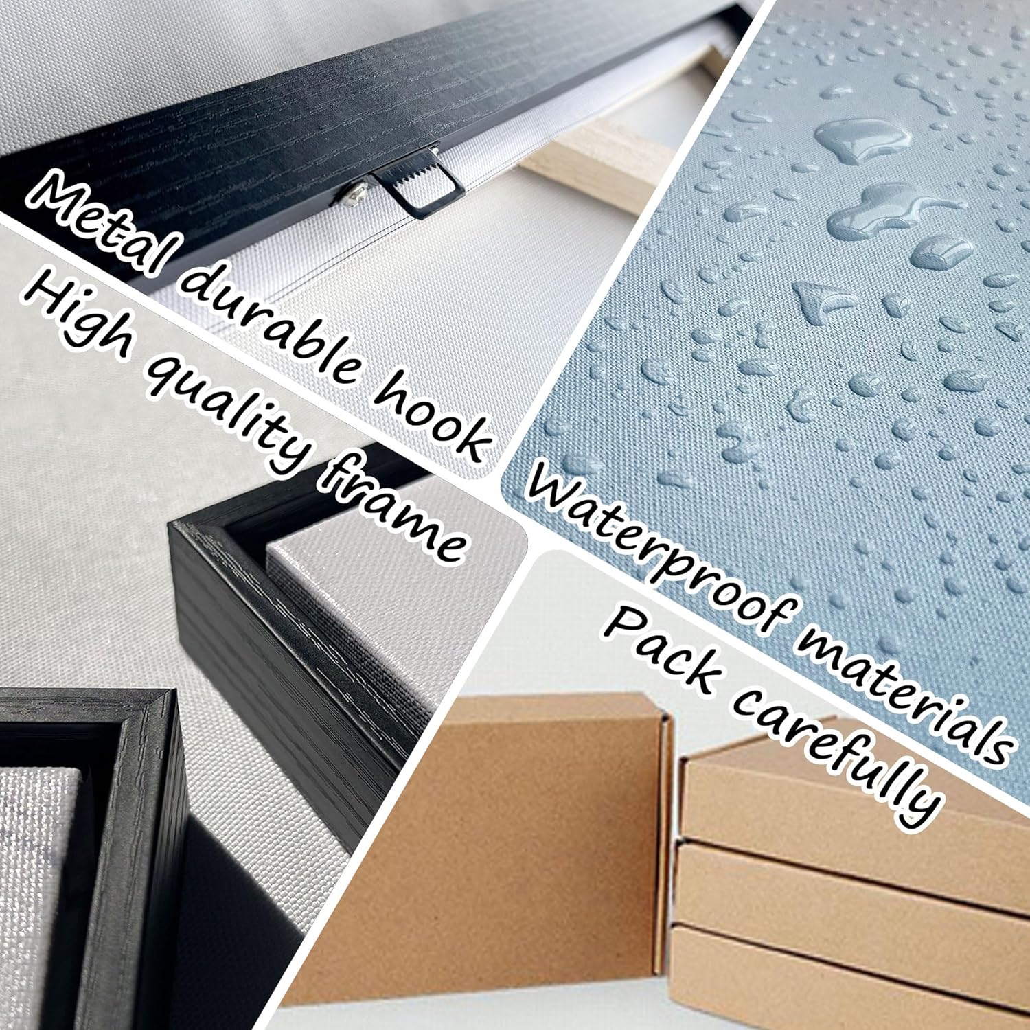 Specificities:Black wooden frame/Sturdy waterproof canvas/Solid wooden frame for the interior/Matching mounting parts/Protective edges/Carton packaging